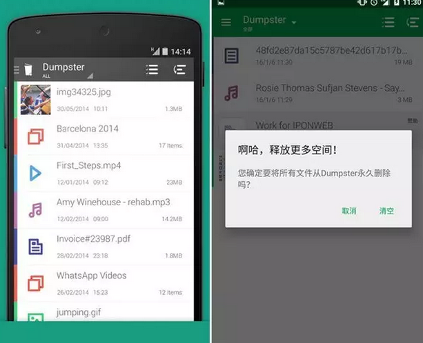 几乎所有在手机中删除的文件在这里都可以看到,根据不同的时间、类型和大小排列成一个个文件夹展示,所以面对大量删除文件时也不会显得凌乱。点开“Dumpster”用户就可以看到近期删除的各类文件,按照分类整齐地归类排列着,每个列表都有部分文件的大小。同时和电脑一样,“Dumpster”有个“一键清空”的选项可以直接清空回收站。