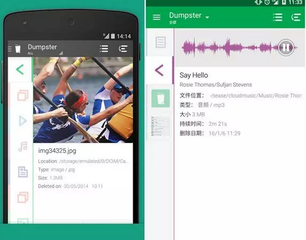 符合手机特性,使用异常顺手“Dumpster”仿照了电脑回收站的思路但也根据手机使用环境做了相应的优化,这使得“Dumpster”在日常的使用中和手机的特性很贴合。在“Dumpster”中用户可以直接预览已被删除的文件内容(包括图片、音乐、视频等),并且包括大小、位置、删除日期等一些基本信息也会显示在下方。