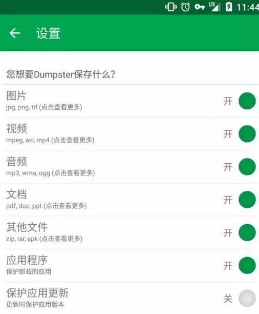 在App的设置中用户可以根据自己的需求做很多调整,例如用户可以选择设定“Dumpster”保护手机上的哪些类型文件,包括了图片、视频、音频、文档、其他文件、应用程序和保护应用更新的功能选项。