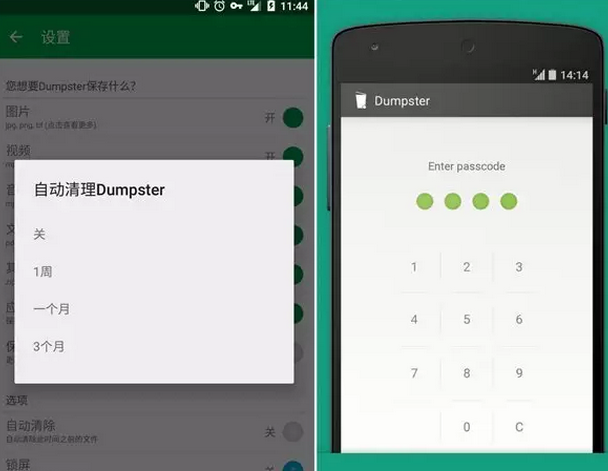 同时对于那些手机内存紧张的用户,“Dumpster”还提供了定时自动清理的功能,用户可以选择一周、一个月、三个月这三种时间周期。用户同时也可以为自己的“回收站”上把锁,设定一个简单的密码。