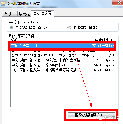 在文本服务与输入怨言选项页面,选中“切换各种语言”,然后点击“更改按键顺序”。