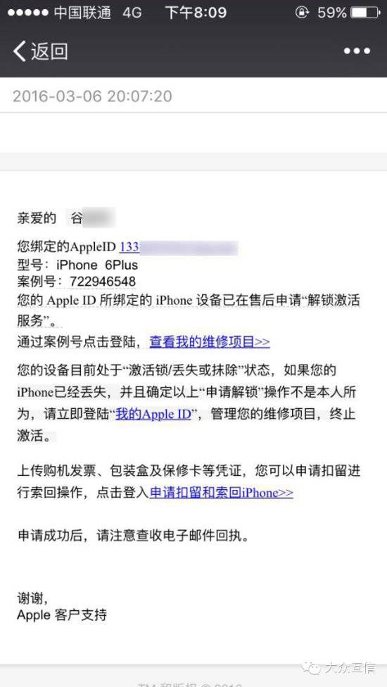 这种钓鱼邮件一般是得到Apple ID账号、电话后给失主发送邮件、短信、打电话等。冒充苹果官方,声称查询到你的手机丢失,有不法分子正在刷机解锁你的手机,现在要阻止刷机解锁,然后为你要Apple ID账号和密码。