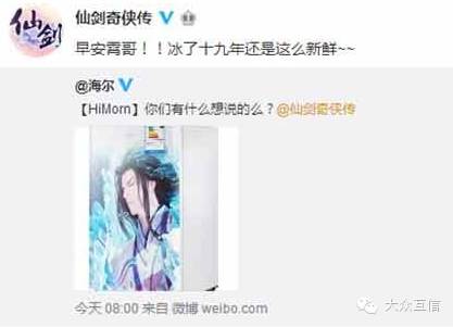 海尔或许也是看到了动漫和游戏玩家的潜在市场,在《海尔兄弟》之后继续发力,近日海尔在官方微博上面向我们展示了一款《仙剑奇侠传》主题的电冰箱,冰箱正面完全改变了之前的设计风格,将《仙剑奇侠传》人物玄霄放到了正面,非常具有中国风。