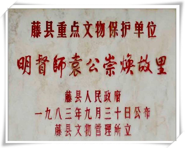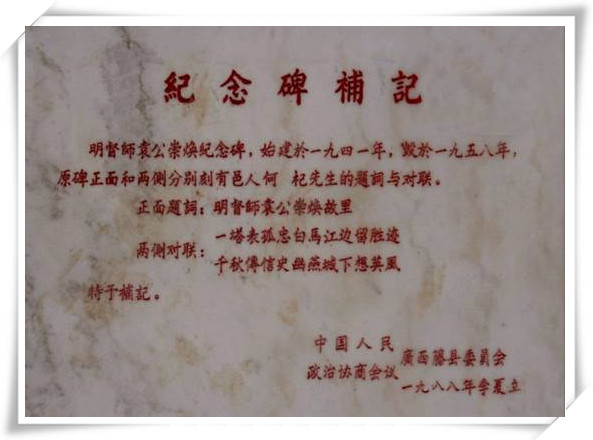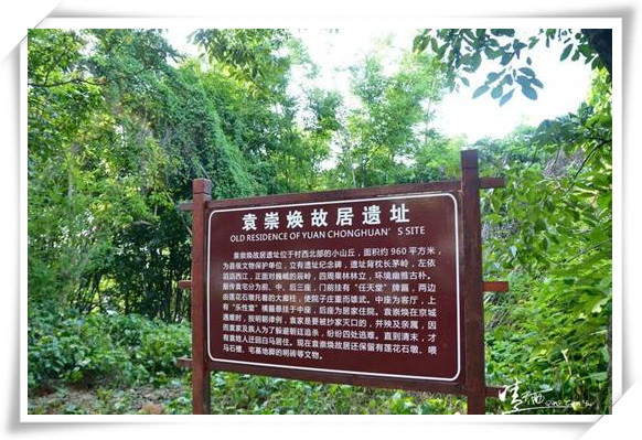 村落东北临河处建有四方形的袁崇焕纪念碑,高10米,每边宽2.5米,白石米末抹面,黄琉璃瓦盖顶,碑脚围有水泥平台栏杆,占地60多平方米,周围绿树成荫,一片寂静。碑塔上刻有原自治区政协副主席莫乃群的题字:“明督师袁崇焕故里”。
