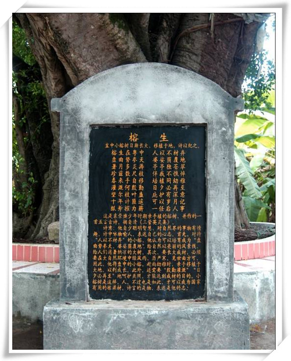 村中池塘数口,青石绕塘,垂柳依依。传说那里最大那棵古榕树是袁崇焕栽的,当年他曾赋诗一首:榕生在粤中,人以不材弃,盘曲势参天,婆娑荫覆地。