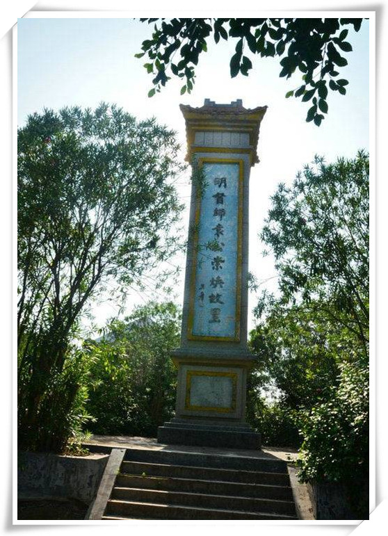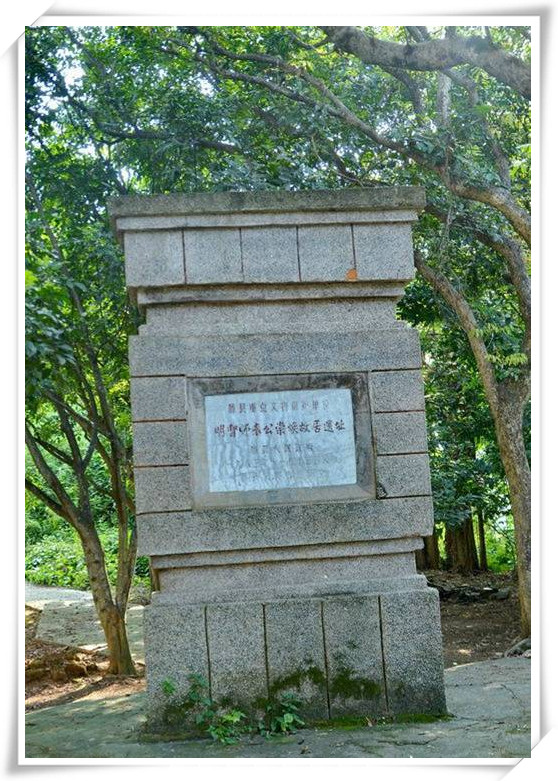 离纪念碑不远,就是袁崇焕故居遗址,至今还存放着几个房柱石墩。据说“民国”三十年在这里曾建有和现在同样高的纪念塔一座,上面刻有对联一副:一塔表孤忠,白马江边留胜迹;千秋传信史,幽燕城下想英风。